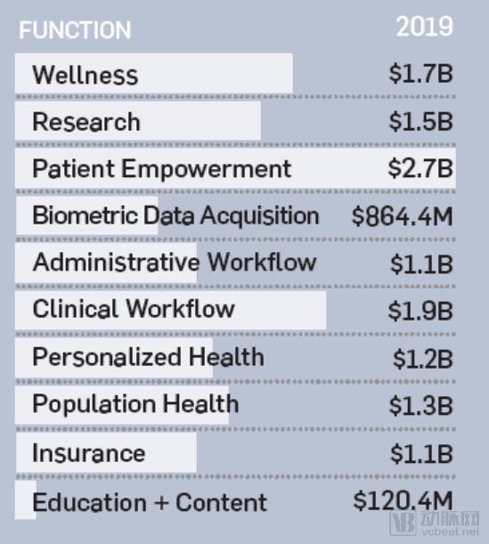 上文提到,由于众多投资机构为“患者赋能”工具提供了资金,我们称2019年为“患者之年”,但还有其他值得注意的趋势。例如, 在支持临床工作流程和管理工作流程领域有资本大量涌入(合计30亿美元),将会转化为对医疗基础设施的重要投资。
