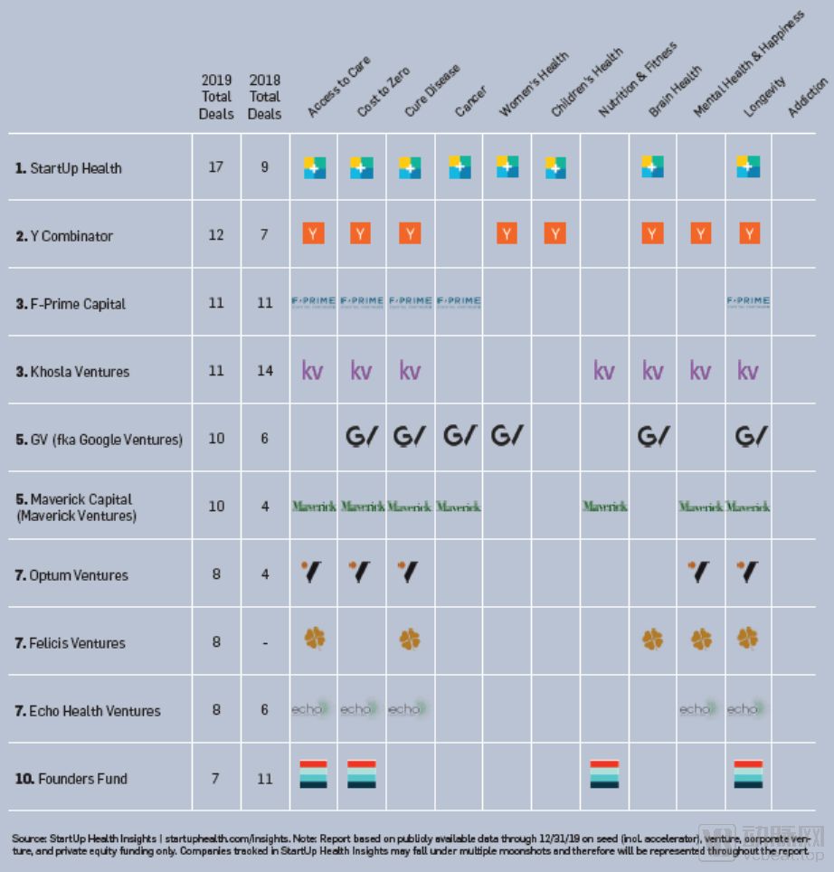 F-Prime、Khosla、Y Combinator和GV等投资者均将资金分散在五个或更多的细分领域上。数据还让我们看到了不同投资机构的差距,这也清楚地表明,如今已经有很多资本不再青睐“阿片类药物成瘾”的领域了。