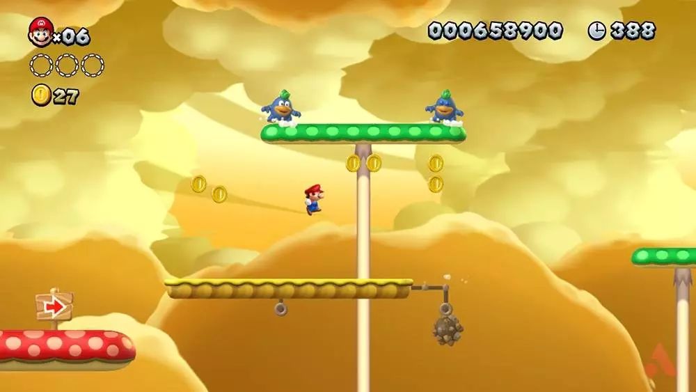 我们对照上方的表格来看,打倒库巴王救公主,游戏逻辑很简单;一局 400 秒,随时可以暂停;画面简洁明快, 辨识度高;几乎没有文本,方向键、跳跃键、肩键、技能键,操作简单;横版跳跃,从左到右,不会晕 3D。最多支持 4 人游玩,一家人其乐融融。