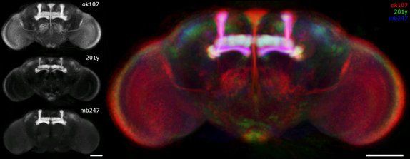 接着计算机程序将这些图像拼接对齐,生成果蝇大脑的 3D 展示图。