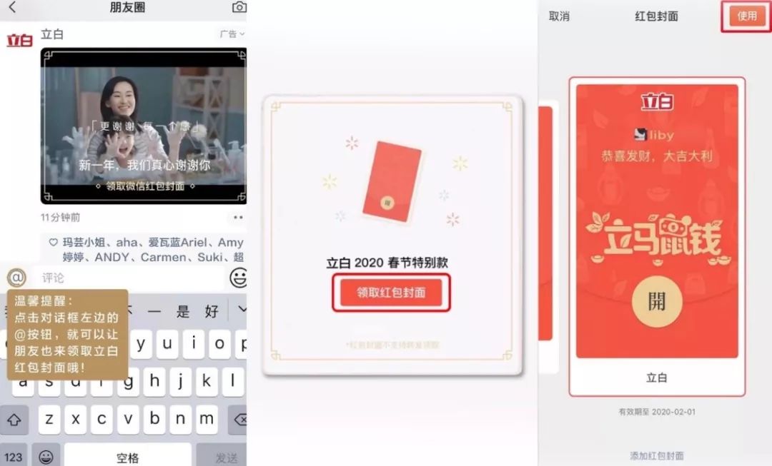 在2018年春节的时候,微信广告的春节限定产品——朋友圈翻转式卡片广告上线:正常点击广告会弹出正常的全屏广告,但如果将该广告点赞后,广告界面会翻转,再点击进去就是对应的小程序了。而这一小小的尝试获得了用户的点赞,微信也由此开始增加互动广告的创新。2019年十支“最受欢迎的广告”,进一步印证了用户的喜好,所以微信今年春节又推出“联合定制红包”的新玩法。