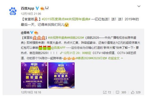 而快手对春晚的争夺并未止步,2019年,百度是春晚独家网络互动平台,这个角色,意味着参与春晚的程度更深,效果也更明显。