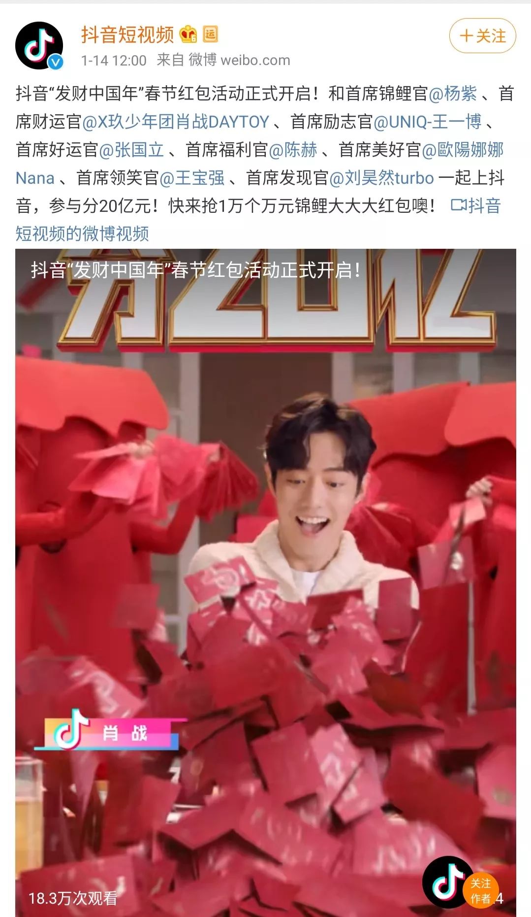 而今年抖音并没有在央视春晚中分一杯羹,目前为止,未看到抖音公布与央视春晚的其它合作内容。也许是感到压力,1月14日抖音方面宣布启动“发财中国年”春节红包活动,将发出20亿元红包。从红包数额上来说,抖音比快手的投入更高。