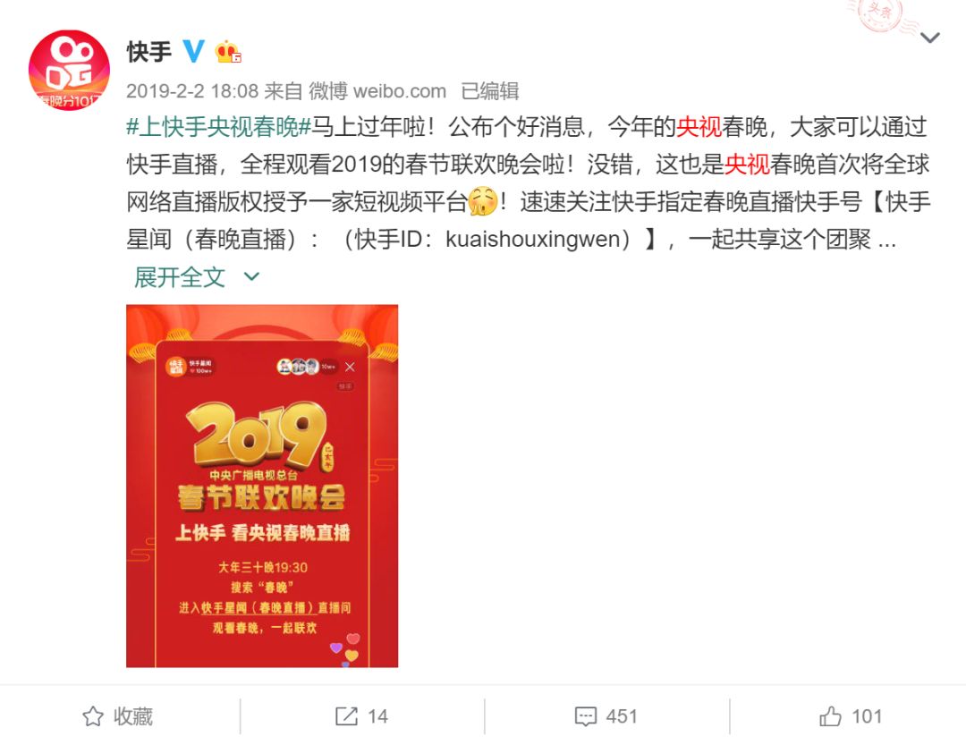 2019年快手官方微博公布拿到央视春晚版权,图源快手官方微博