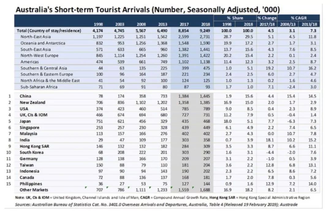 澳洲旅游业的兴起也拉动了当地经济,与旅游相关的行业开始蓬勃发展。从1998年到2018年,澳洲的短期游客呈现逐年增长趋势。