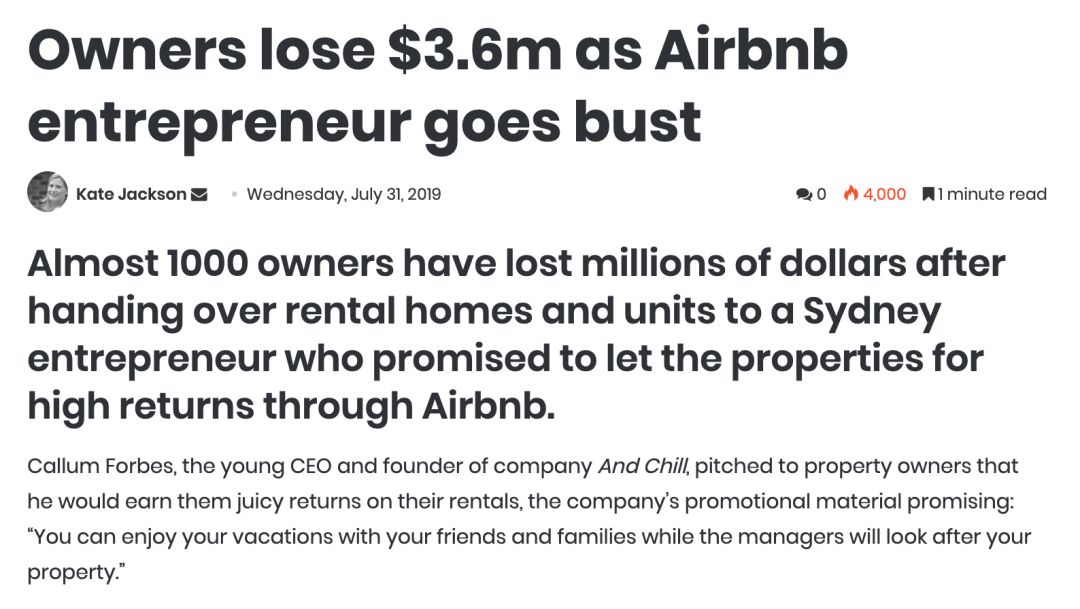 除了这些问题,有些管理公司的运营状况也令人堪忧。前几年很火的 Airbnb 管理公司 And Chill 一夜之间破产,近1000名业主损失数百万美元。从这里也不难看出,Airbnb 的管理难度远没有想象的轻松简单。