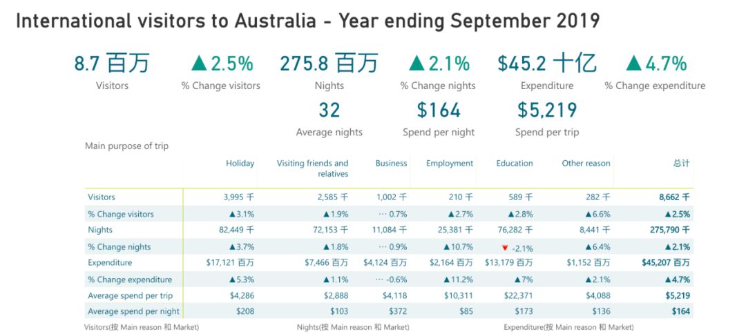 拥有独特自然旅游资源的澳大利亚,一直都是一个旅游大国,根据澳大利亚统计局2019年9月的调查数据,在过去的9个月中,共有870万游客来澳旅游,并在澳洲创造了452亿美元的消费。