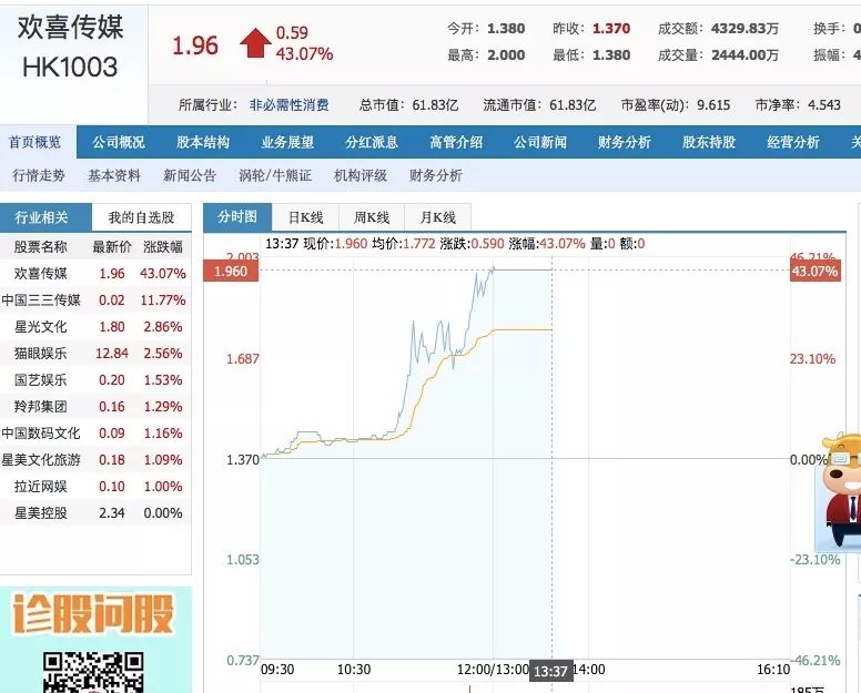 同一时间,《囧妈》主要出品方欢喜传媒发布公告,与头条系母公司字节跳动展开合作,字节跳动将支付至少6.3亿元人民币。欢喜传媒股价直线拉升,目前涨幅超过43%,欢喜传媒今天半天市值涨了将近20亿港币,这笔生意做得真是赚上加赚。