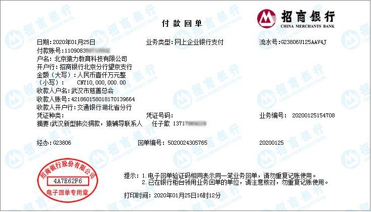 猿辅导公司向武汉捐款一千万元人民币 用于抗击新型肺炎疫情