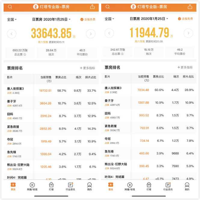 根据灯塔专业版数据,截至1月23日下午15点11分,大年初一当天,累计预售票房达3.36亿人民币,其中光《唐人街探案3》一部影片的预售票房就突破了2.36亿。不过随着肺炎疫情爆发,退票情况已经开始在各大购票平台蔓延。