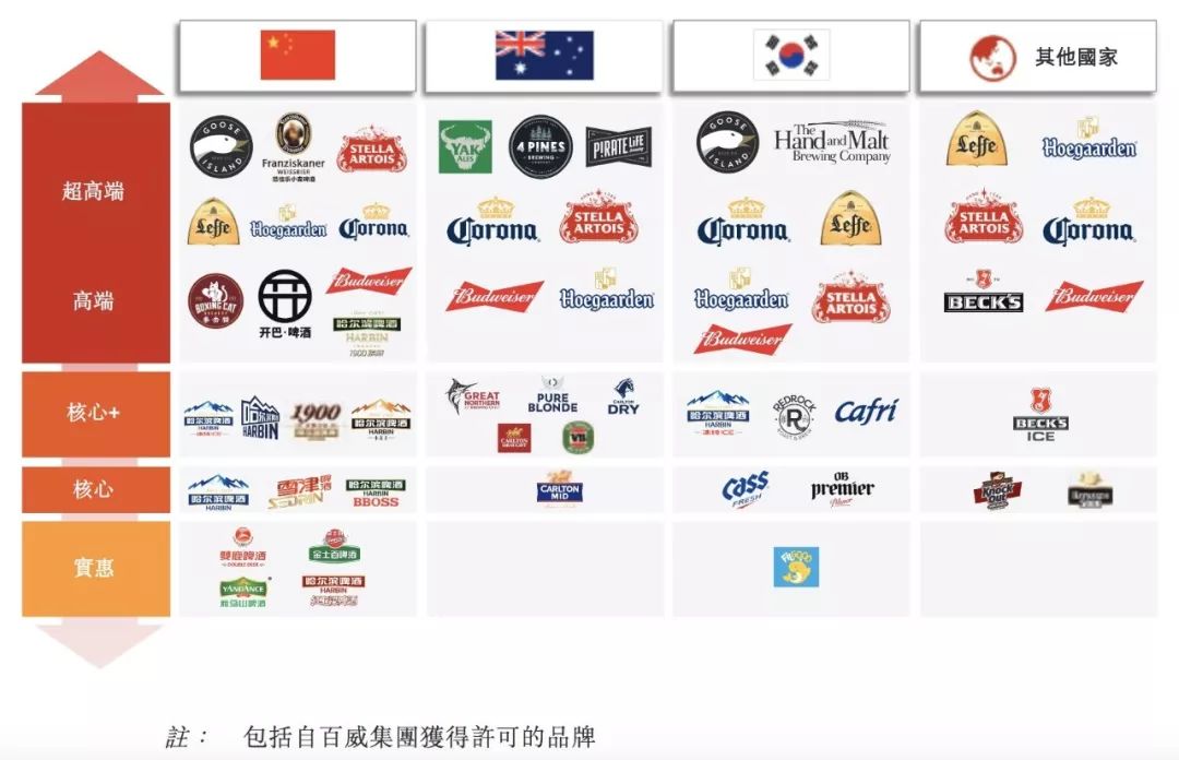 目前,百威亚太品牌按价格分为高端及超高端、核心及核心+、实惠品牌三大类,囊括百威、时代、科罗娜、福佳、贝克、范佳乐、莱福、凯狮、哈尔滨等50个品牌(自有或获许可使用)。其中,高端及超高端品牌贡献了百威亚太绝大部分收入。