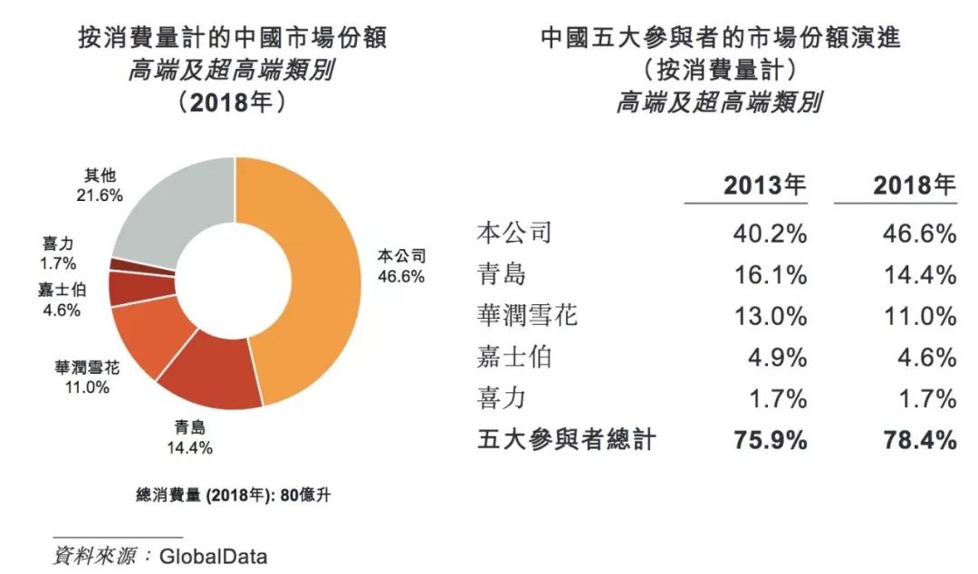 据GlobalData数据显示,2013-2018年,中国啤酒市场高端及超高端类别中,百威亚太市场份额(按消费量计)排在第一位,占比从40.2%上升至46.6%,比排在其后的青岛、华润雪花、嘉士伯、喜力市场份额总和还高。