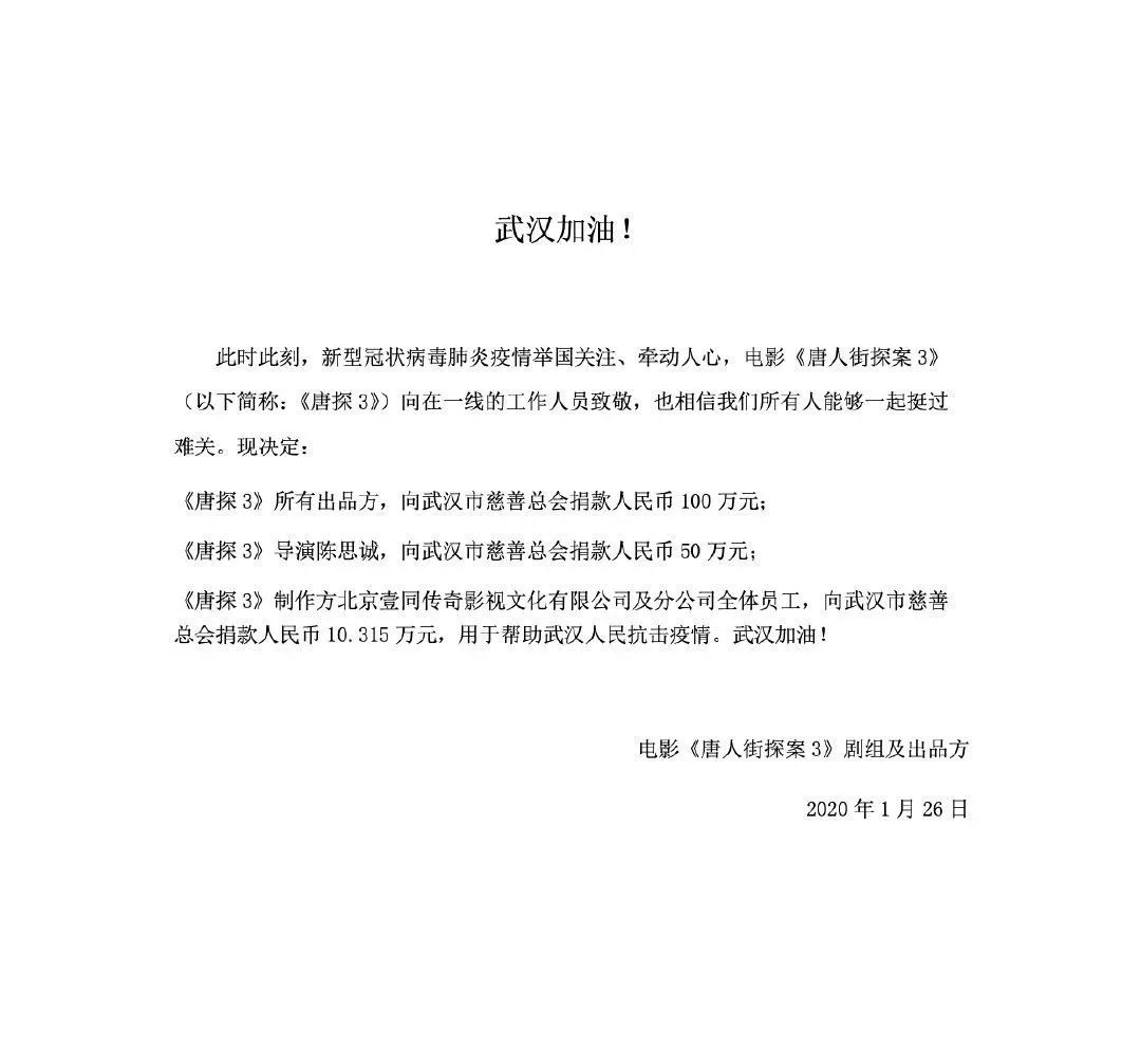 当然,日渐严重的疫情也并没有让他们彻底放松,今天《唐人街探案3》已经率先给武汉慈善总会捐出超过100万元的善款,帮助疫情重灾区早日回归正常。