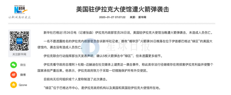 据新华社巴格达1月26日消息,伊拉克内政部官员26日说,美国驻伊拉克大使馆当晚遭火箭弹袭击,未造成人员伤亡。一名不愿透露姓名的伊拉克内政部官员告诉记者,数枚“喀秋莎”火箭弹26日晚落在位于伊首都巴格达“绿区”的美国大使馆内,袭击没有造成人员伤亡。伊拉克联合行动指挥部当天发表声明,确认5枚火箭弹击中“绿区”,但未透露更多细节。目前尚无任何组织或个人宣称制造了此次袭击。(新华社)