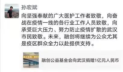四天前,也就是1月23日,他旗下的融创中国(1918.HK)向武汉市红十字会捐赠1000万元。那天,老孙并没有发朋友圈。