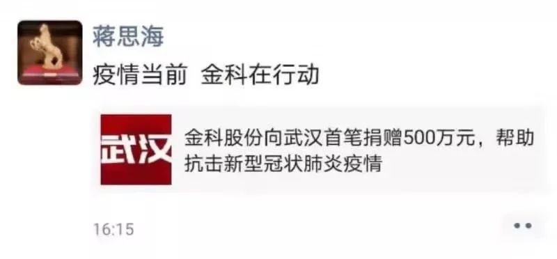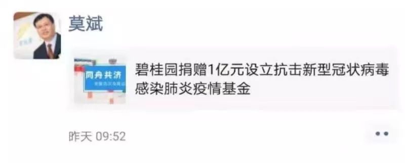 就在除夕夜,碧桂园在捐钱的同时,还捐出首批6万只专业医用防护口罩等物资,集团总裁莫斌通过朋友圈转发了捐赠信息。这是2020年他发的第一条朋友圈,但他没有配发转发语。