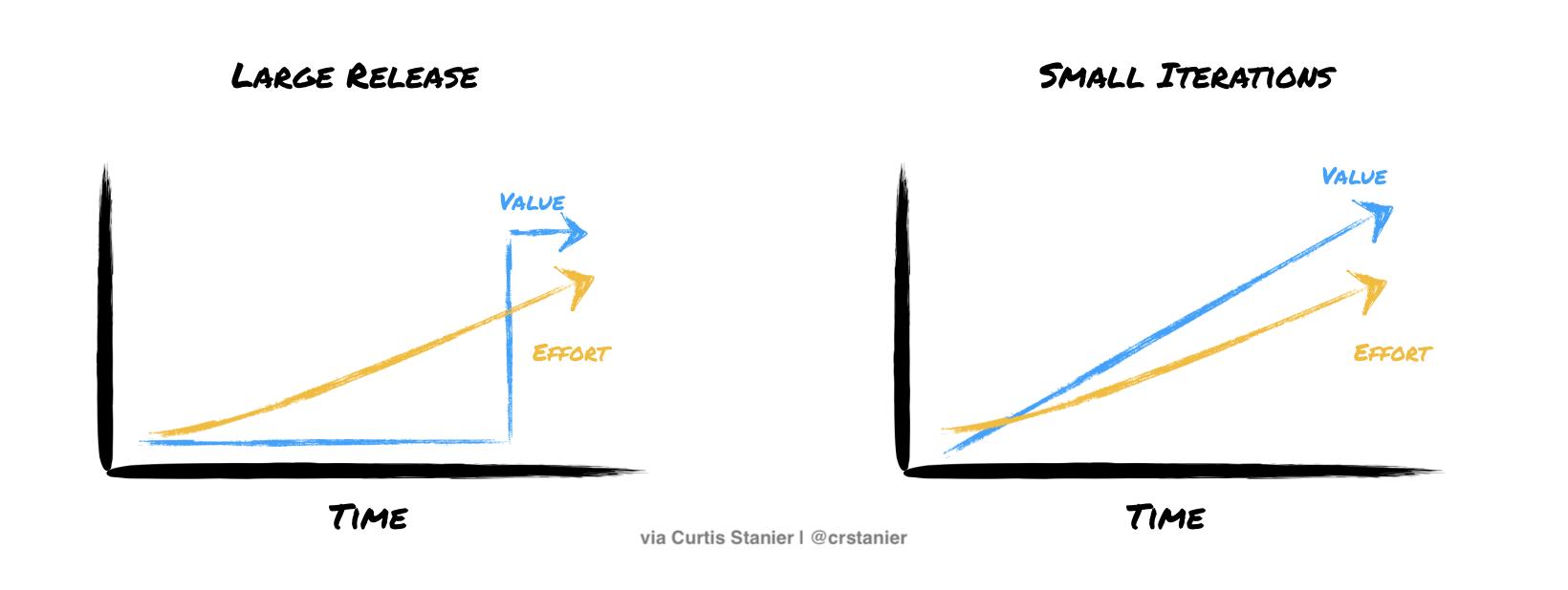 左图为重大更新,横轴为时间,黄色箭头代表的是付出,蓝色箭头为价值;右图为小型迭代更新。
