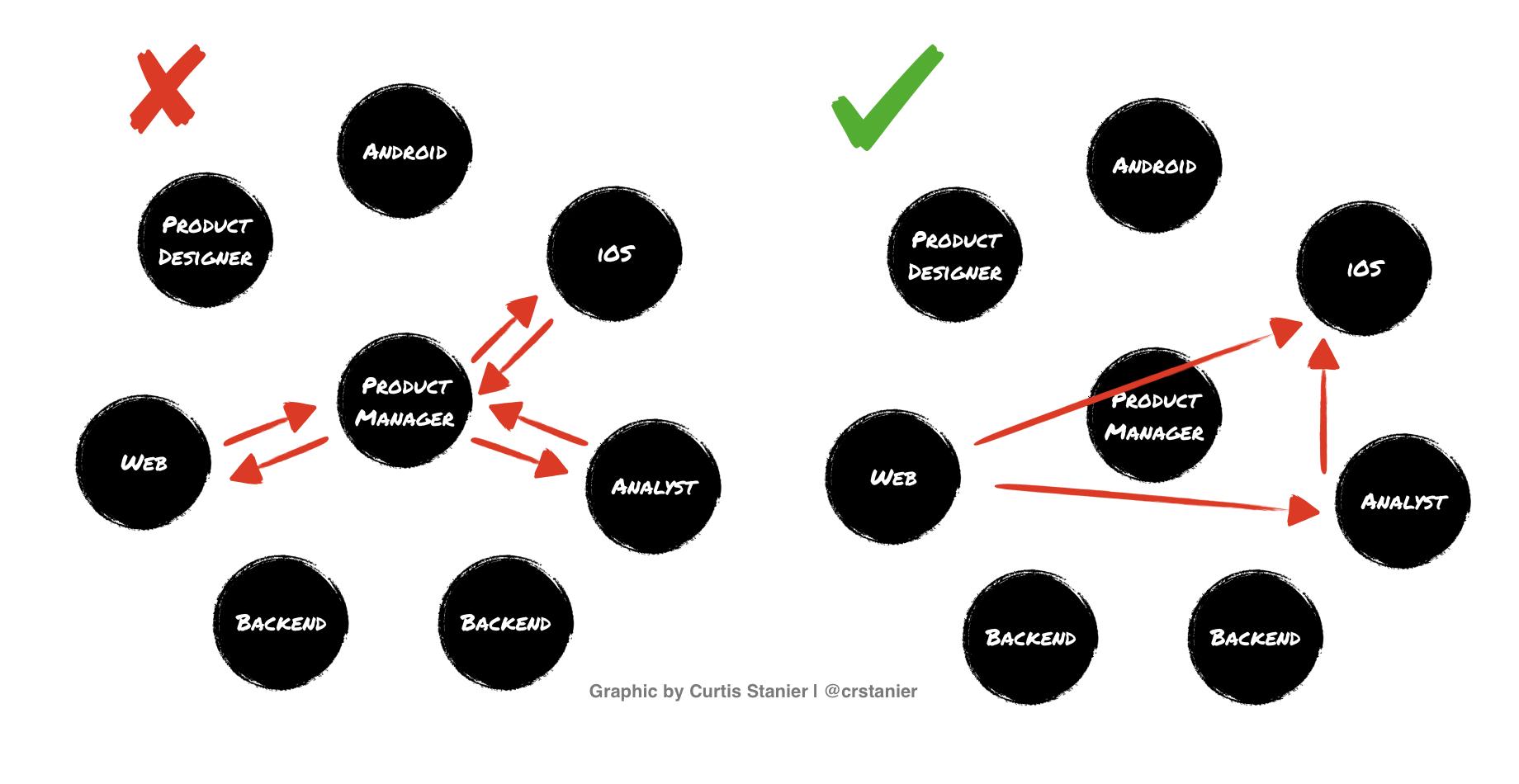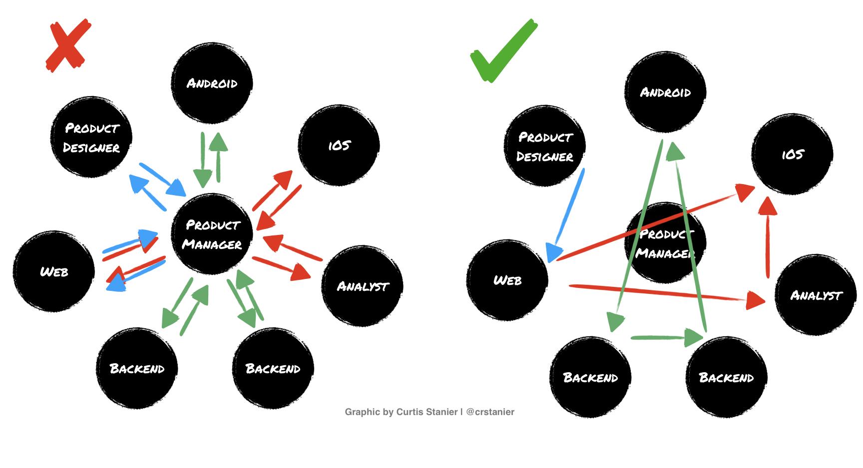 相比之下,在图表右侧的工作场景示例中,如果网页端开发工程师能够直接跟产品分析师沟通,从他那里了解有关需求,然后他们再直接跟iOS系统开发工程师保持同步沟通,这样也能完成这项工作。