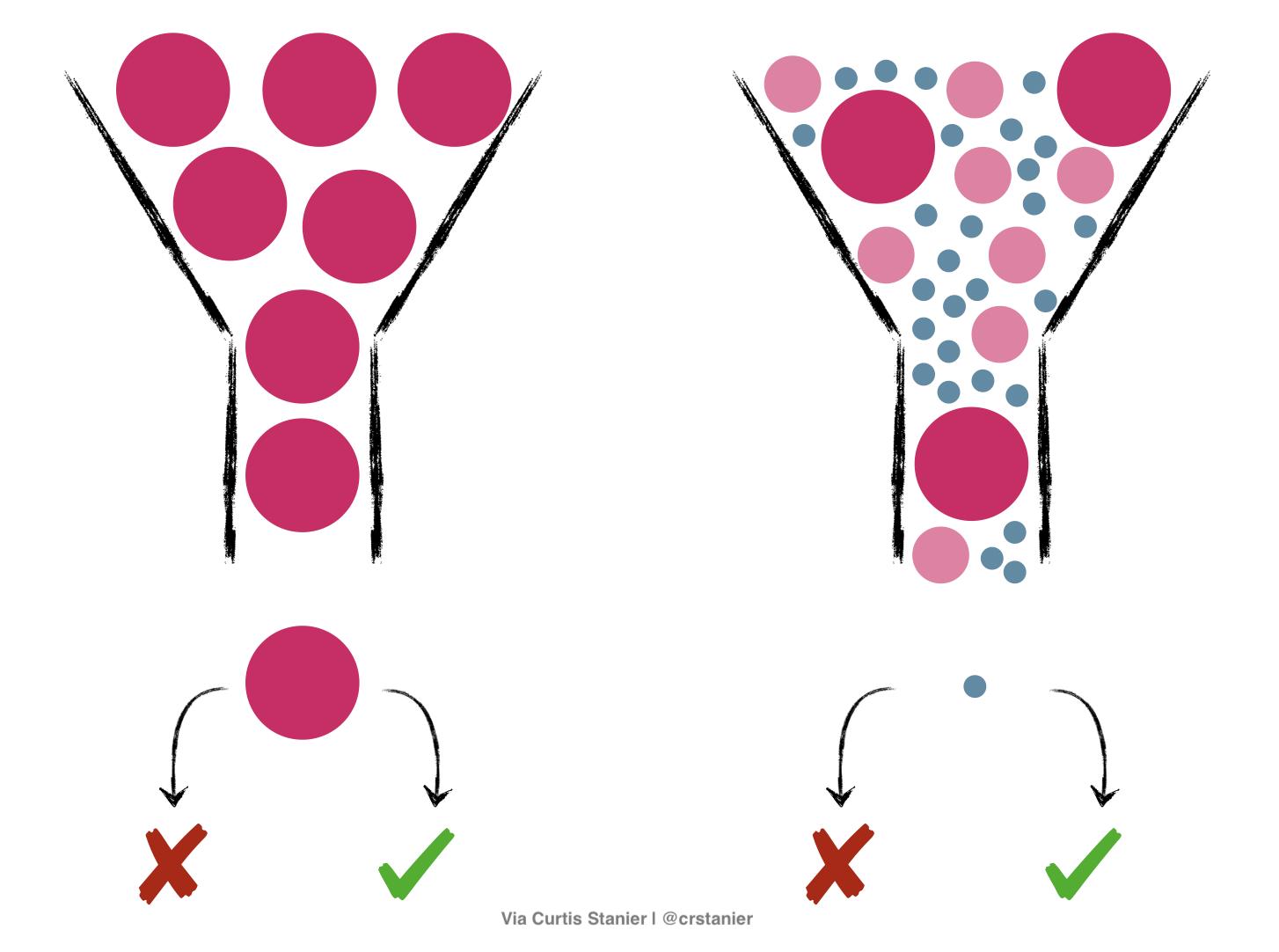右图中的漏斗就可以体现相对更大的灵活性。小任务(蓝色圆点)可以快速通过漏斗并得以验证。如果验证成功,我们就可以投入更多精力(粉色圆点)。否则,我们就只需要在相对投入较少的情况下再次迭代。