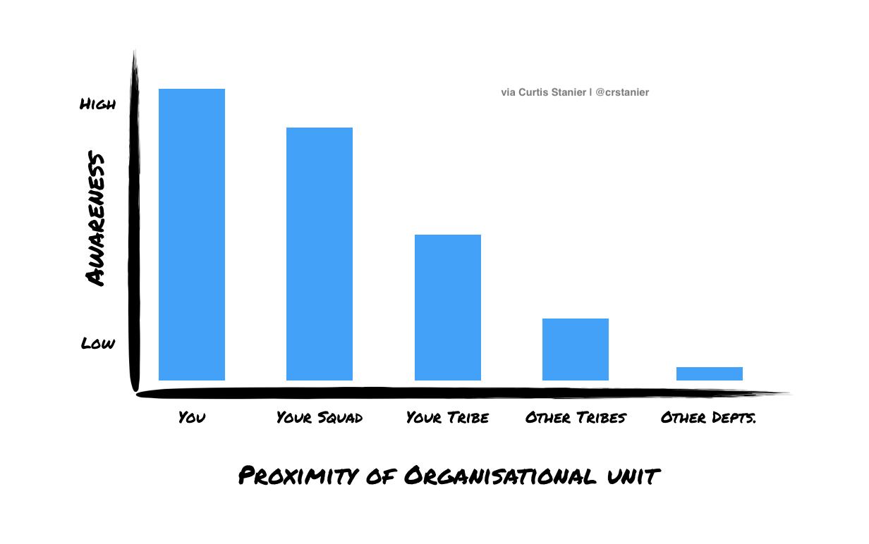 团队组织(或个人)大小与意识的关系图。纵轴从上到下反映的是意识最高与最低,横轴中,最左是个人,随后是越来越大的团体,分别是小分队、大团队、其它团队,及其它部门。