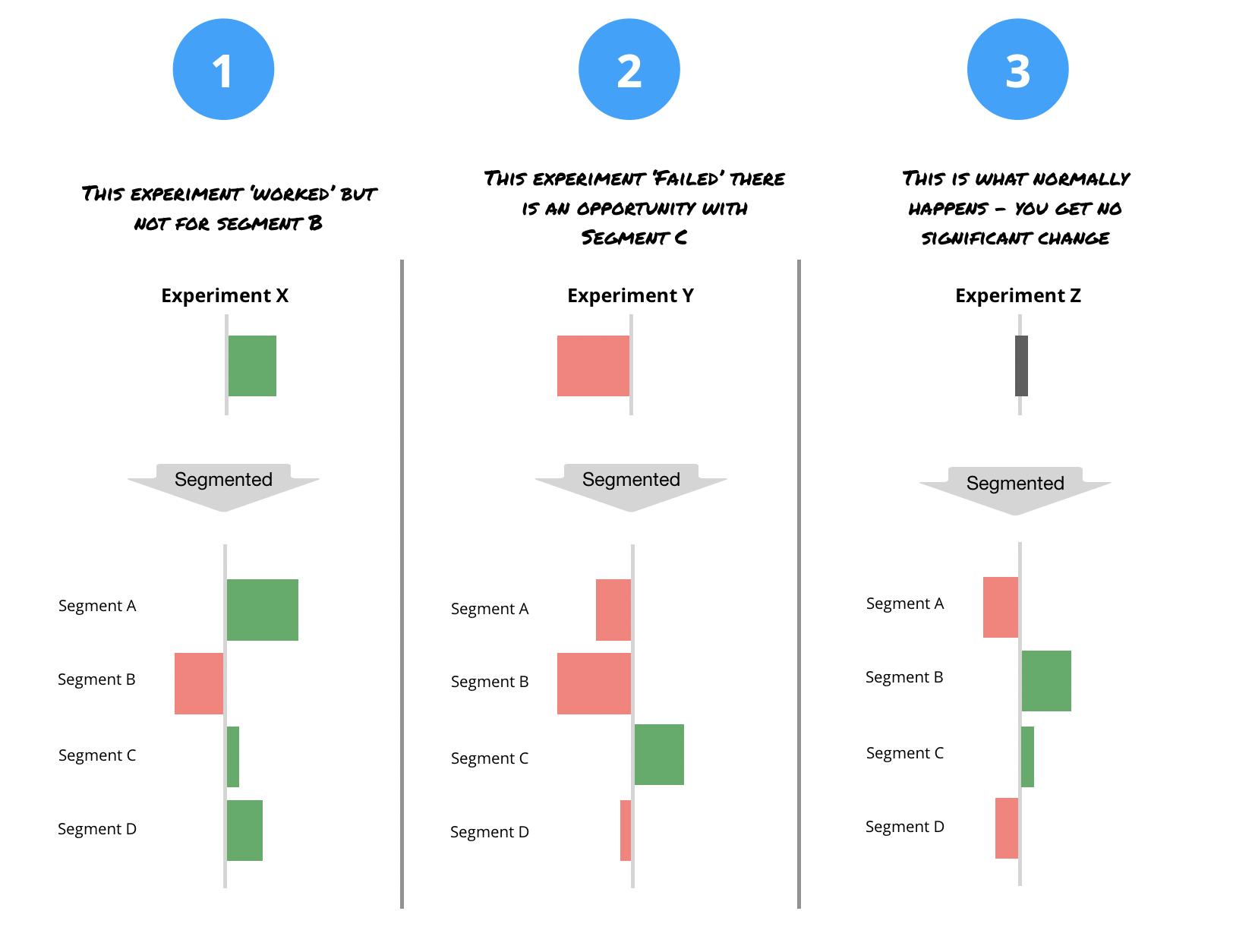 图表中的三个案例,分别对应的是三种不同的假设性实验。案例一中的实验X,反映的是效果提升;中间案例的实验Y,则体现的是实验失败,而右方案例三的实验Z,则没有特别的效果。