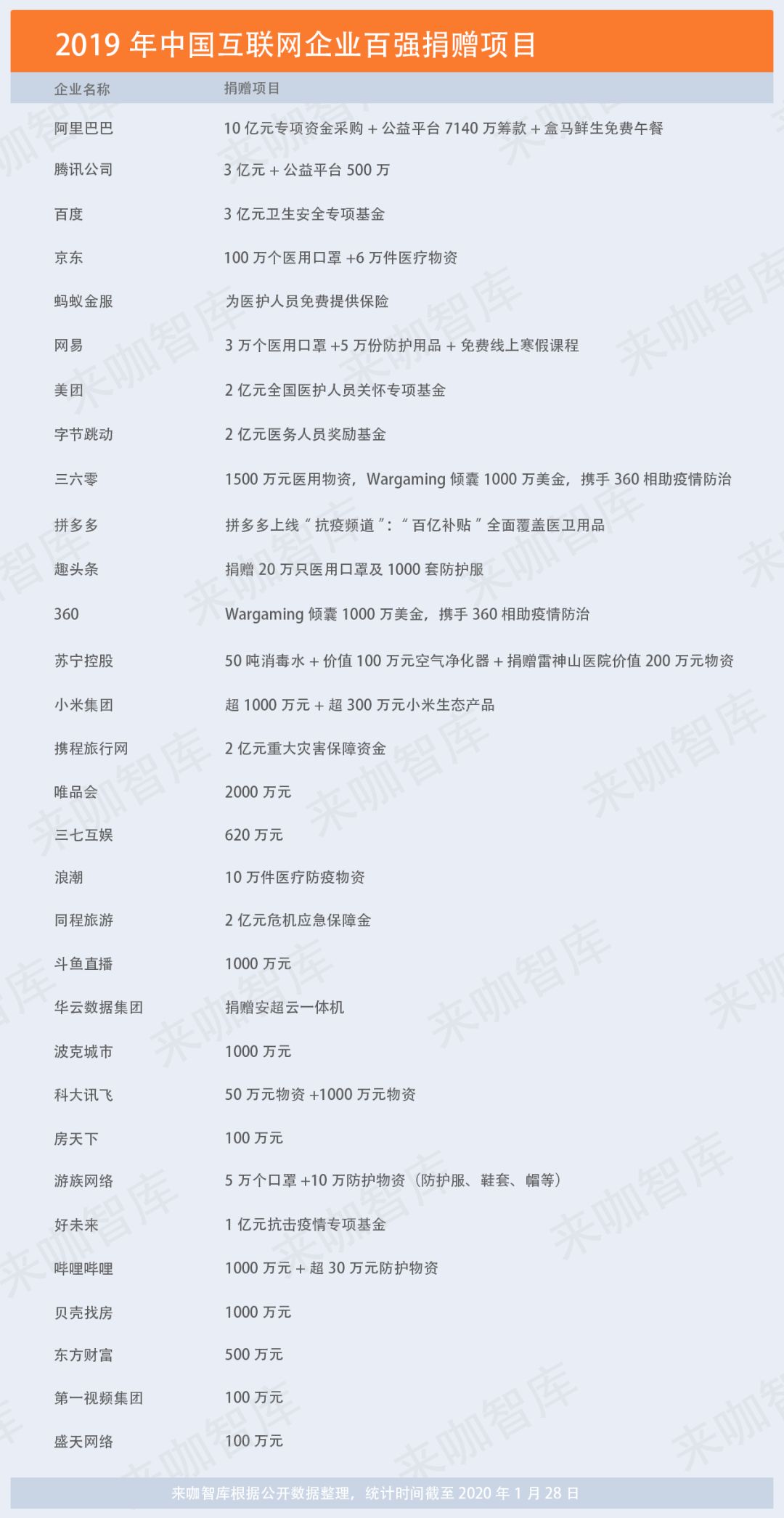 最后,根据2019年中国互联网企业100强名单,来咖也借此首次梳理了其中一些企业驰援疫区的捐赠项目,截至1月28日18时的不完全统计,百强中已有28家企业进行了不同形式的捐赠。当然,除了这个百强名单之外,还有乐信、快手、水滴、跟随学、猿辅导、瑞幸、360金融、即刻公司,以及联想、华为等更多互联网、科技公司,也都进行了不同程度、不同形式的捐赠。