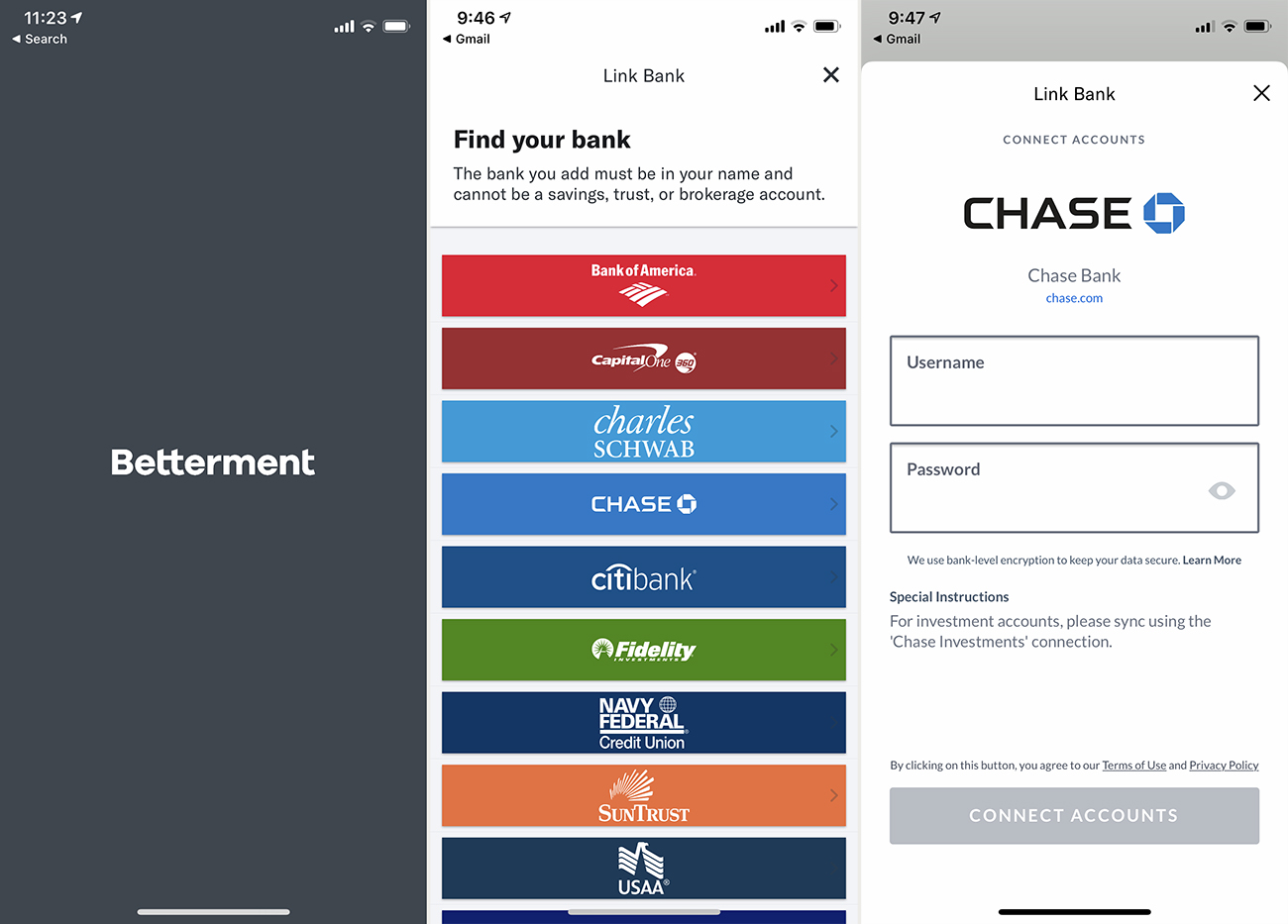 这听起来有点吓人,好吧,是有一点!银行的登录信息是消费者拥有的最敏感的凭证之一,在美国,拥有银行账户的人中有四分之一与 Plaid 共享这些凭证信息。所有这样做的人,几乎都是因为找不到更好的解决方案,举个例子,当你打开智能投顾软件 Betterment,尝试添加一个银行账户时,以下是显示界面: