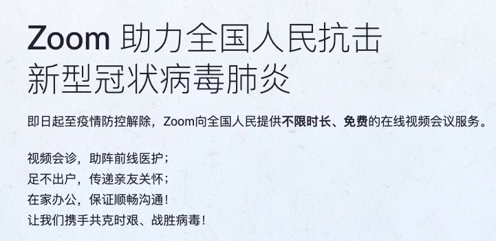 Zoom 创始人兼总裁袁征毕业于中国山东科技大学,在疫情爆发之时,袁征发了这样一条朋友圈:「心系武汉!同舟共济!自一月 27 日星期一起,Zoom 视频会议服务面向中国用户免费。」现在,从 Zoom 在国内的官网我们已经可以看到这项支持。