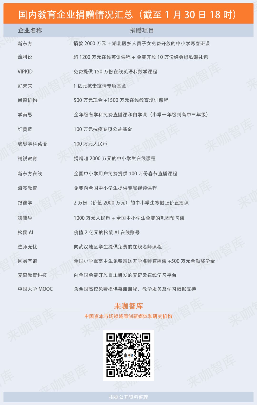关于国内教育企业此次的捐赠情况,来咖智库也做了一个不完全的梳理,在统计到的18家国内教育企业中,真正提供真金白银捐赠的,只有新东方、好未来、红黄蓝、瑞思英语、猿辅导这5家,其它企业都是推出一些面向全国或者湖北地区的免费在线课程,甚至还有过亿价值的免费课程。