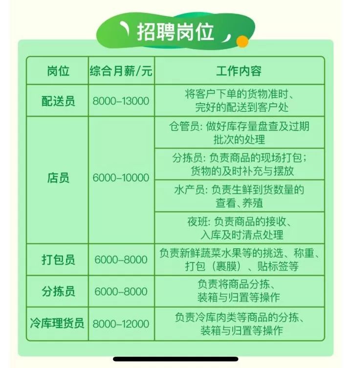 「电商在线」发现,打开叮咚买菜app,就直接在首焦位置挂上了招聘链接,主要招聘岗位就是配送员、打包员、分拣员、冷库处理员等基础岗位。