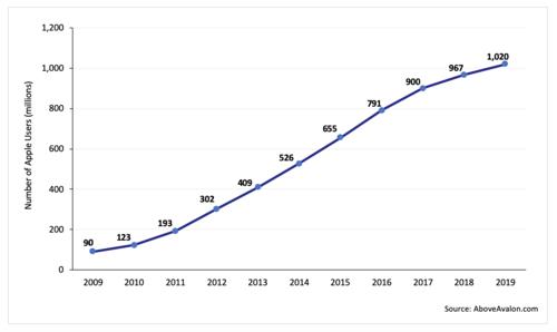 下图显示的是2009年至2019年苹果用户数量的增长曲线,这一部分群体也称作用户基数。