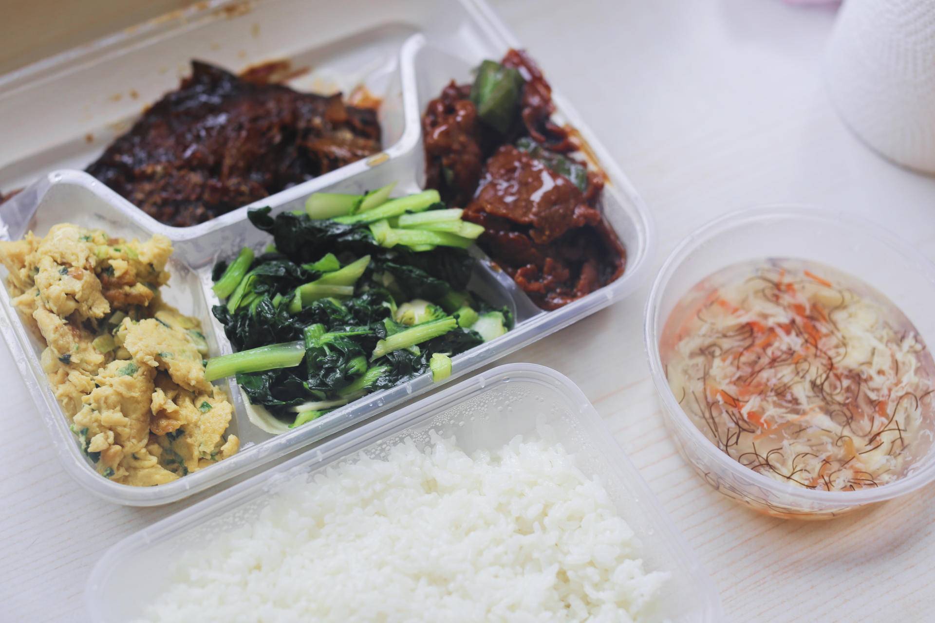 酒店每天提供三餐,菜色我觉得真的没得挑。早上8点到10点之间会送早饭,中午12点到1点会送午饭,晚饭是晚上6点到7点,早饭一般是包子、粥、饺子这类,午饭和晚饭是盒饭,四菜一汤,种类和营养搭配都很好。