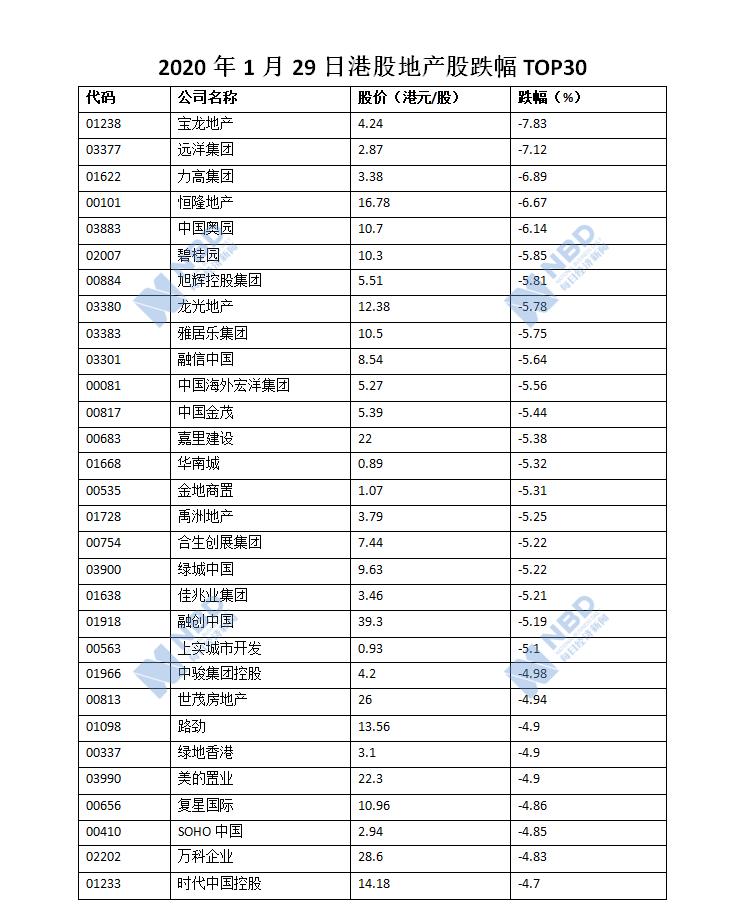 受到大盘影响,港股房地产股持续走弱,全线下挫。截至1月30日收盘,万科企业报收27.5元/股,跌幅为2.97%;中国海外发展报收25.35元/股,跌幅为2.31%;融创中国收于37.7元/股,跌幅为4.07%;佳兆业集团收于3.27元/股,跌幅为5.49%。