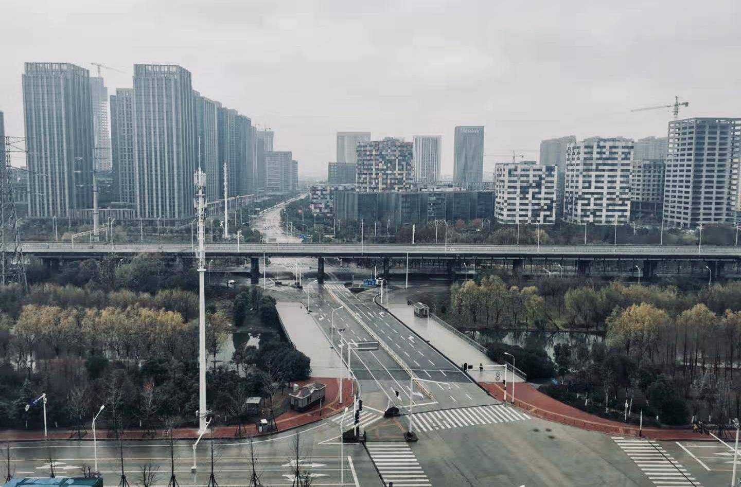沈浩在家里阳台拍摄的武汉城区,南三环道路上空无一人一车
