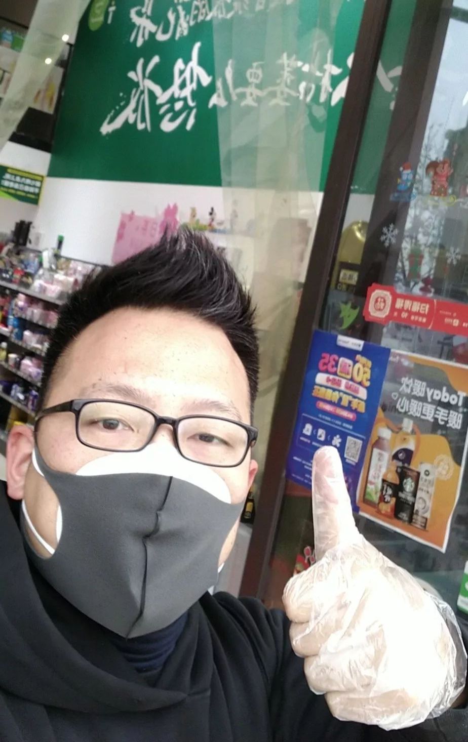 独自守店的杨密自拍(他戴着公司为每个仍在开业的门店配备的口罩)