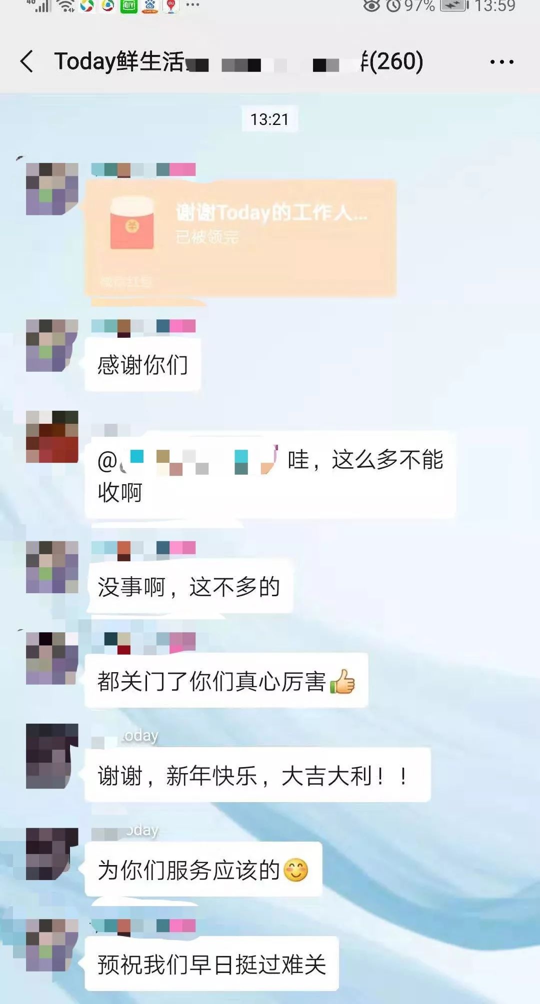 有顾客来到我这个店会说:“还好我们这个小区有便利店还开着,不然这日子怎么过?”还有顾客在微信群里给我们发了红包说,“感谢你们,(其他店)都关门了,你们真心厉害”。