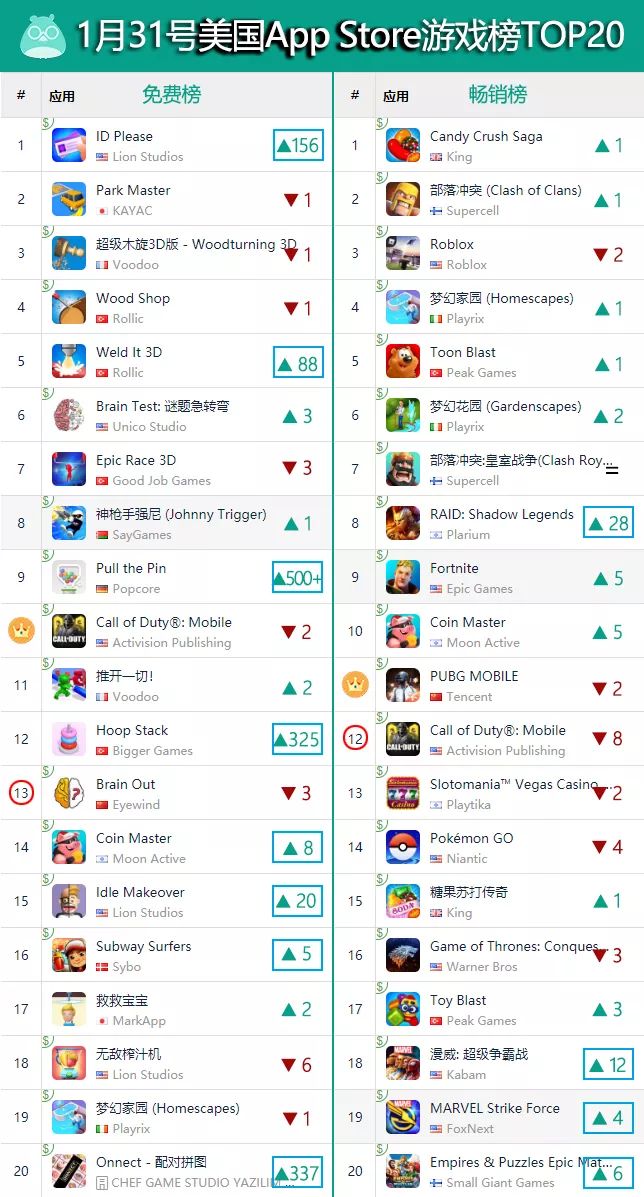 本期成功打入美国市场榜单头部的出海游戏仍然只有3款。《Brain Out》、《使命召唤手游》以及《PUBG MOBILE》。其中《使命召唤手游》仍然同时打入美国市场双榜TOP20,而《Barin Out》则是继续稳守免费榜TOP13,而《PUBG MOBILE》则是稳守畅销榜TOP11。