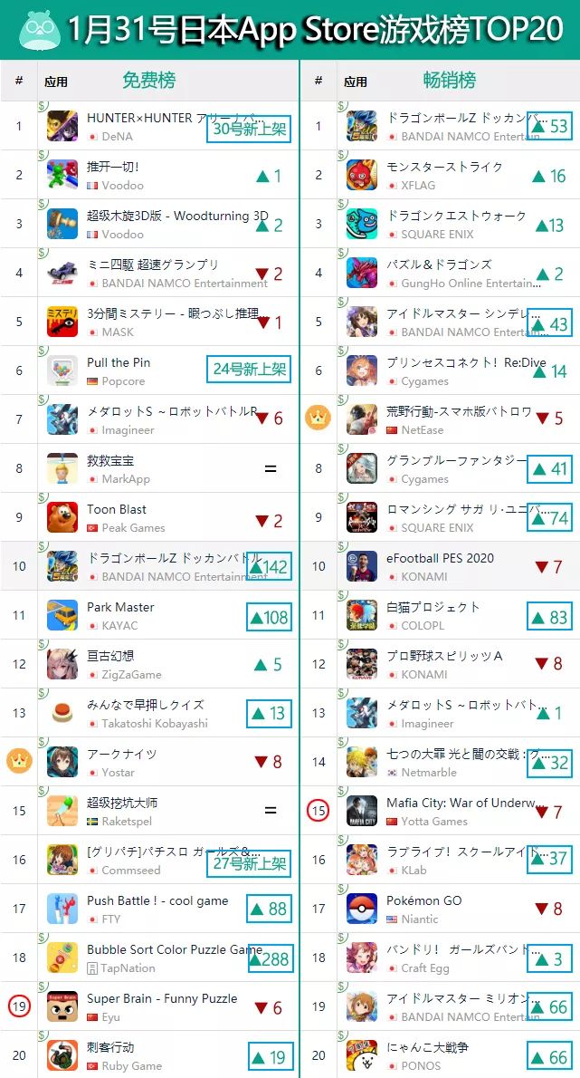 免费榜方面,《明日方舟》以及《Super Brain》继续稳守免费榜;畅销榜方面,则是仅剩下《荒野行动》以及《黑道风云》两个“常青树”仍然坚守在日本畅销榜头部。