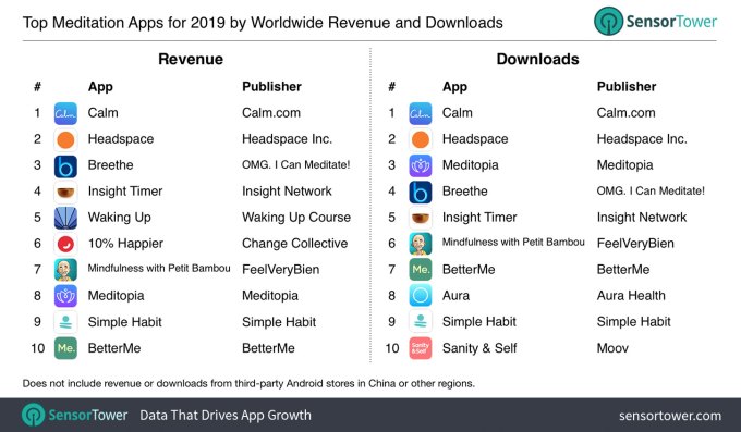 根据外媒 Techcrunch 报道,Sensor Tower 的最新数据显示,TOP 10 的冥想应用在 2019 年一共获得了 1.95 亿美元的总收入,同比增长 52%。