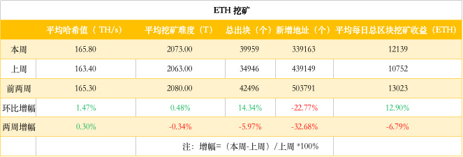 etherchain.org 数据显示,平均算力环比上涨 1.47%,暂报 165.8TH/s;上周矿工活跃度下降,新增地址环比下降 22%;出块量环比上涨 14%,每日挖矿收益上涨 12%,暂报 12139 个 ETH。