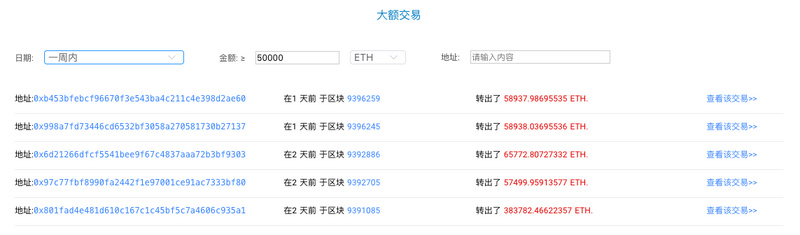 上周,“5 万 ETH 以上”转账次数共计 6 笔,最大转账金额 38.3 万个 ETH,转入与转入地址未知;另有一笔 5.8 万个 ETH 转账,转入地址为 Bitfinex 交易所。
