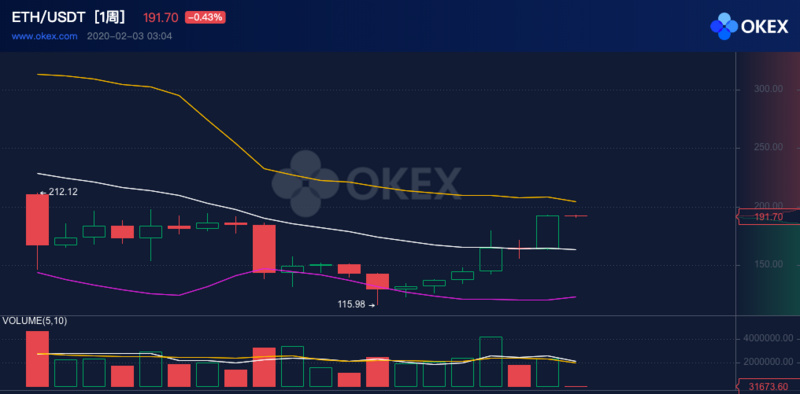 OKEx 行情数据显示,上周 ETH 价格震荡上行,顺利突破 190 美元,周内收于 192.52 美元,一周涨幅达 17.88%。