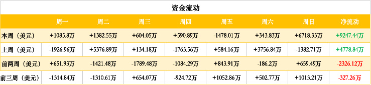 资金方面,上周资金波动较大,周日净流入资金最多,超过 6200 万美元;周五净流出资金最多,超过 1400 万美元。