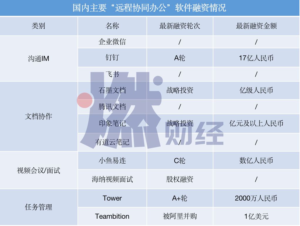 这一赛道中不乏巨头身影,阿里的钉钉、腾讯的企业微信、字节跳动的飞书已拥有大批用户,石墨文档、小鱼易连等创业型公司也曾获得上亿人民币融资。