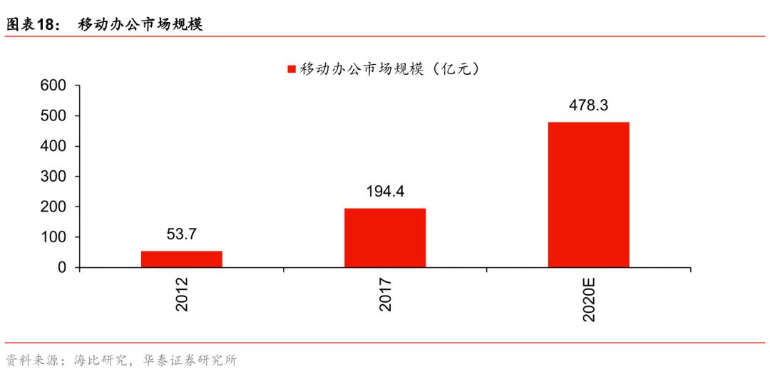 随着企业数字化程度提升,移动办公市场规模也在不断增长。据华泰证券研究所和海比研究数据显示,2012年、2017年国内移动办公市场规模分别为53.7亿元、194.4亿元,2020年市场规模预计将达到478.3亿元。