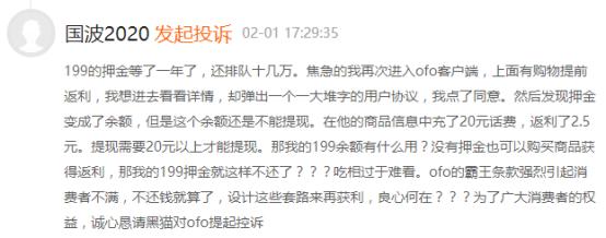 总之,用户如需将自己的99元或199元押金提现,至少仍需要在ofo平台上消费大几百元甚至是2000元,这显然是那些迫切希望退回押金的用户所不能够接受的。在他们看来,这是ofo拖延退还押金,变相强迫买卖的又一套路,根本不是所谓的“无需排队,押金提现”。