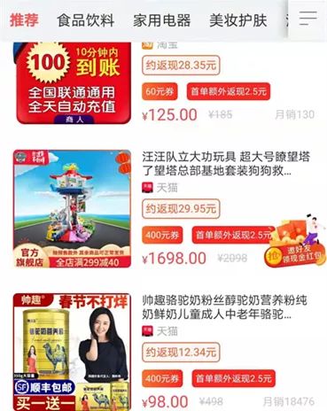 并且新芽NewSeed发现,ofo平台上的商品返现比例并不相同,比如充值125元话费可以返现28.35元,购买一款1698元的玩具却只能返现29.95元。