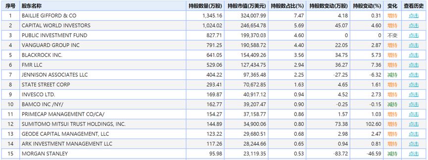 目前,特斯拉的前五大机构股东分别为Baillie Gifford(占股7.47%),Capital World Investors(占股5.69%),Public Investment Fund(占股4.60%),Vanguard Group(占股4.40%),及BlackRock(占股3.56%),持股均为二级市场交易。