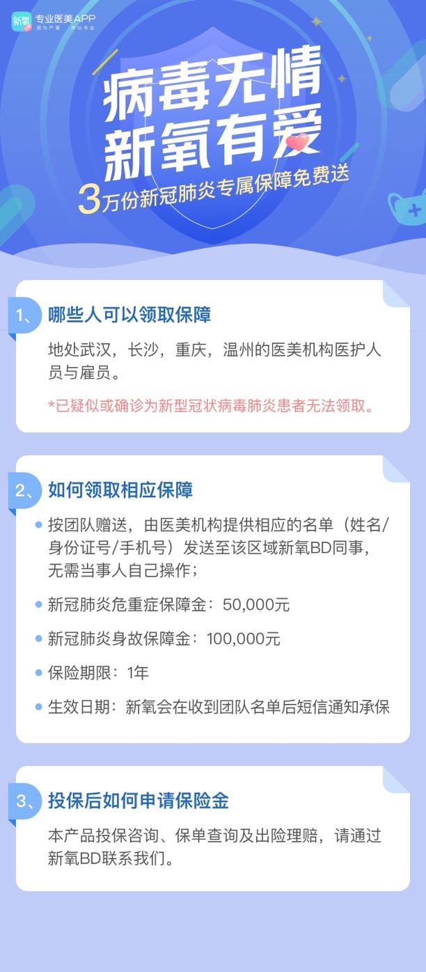 新氧的保险团队将为武汉,长沙,重庆,温州四座城市医美机构的所有医护人员赠送新型冠状病毒引发肺炎的专项保险,提供最高15万元的保障金,总计3万份。(承保细节另行详细说明)