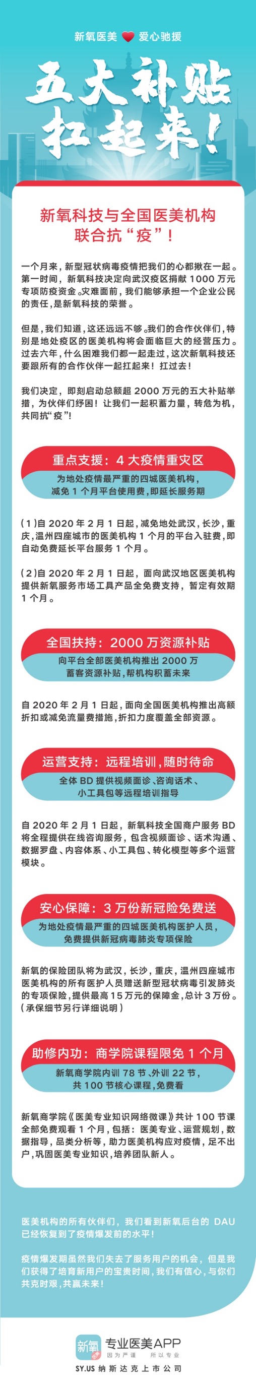 2月2日,新氧科技正式发布《五大补贴扛起来!新氧科技与全国医美机构联合抗“疫”!》的公告,宣布面向整个中国医美行业推出总额超过2000万元的五大补贴措施。